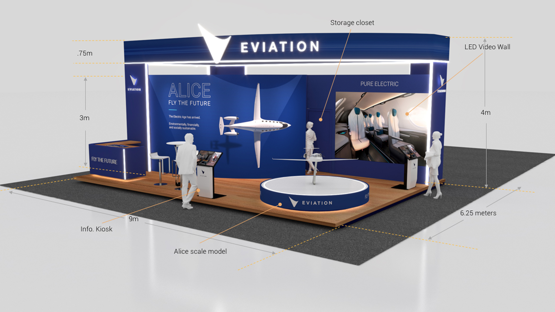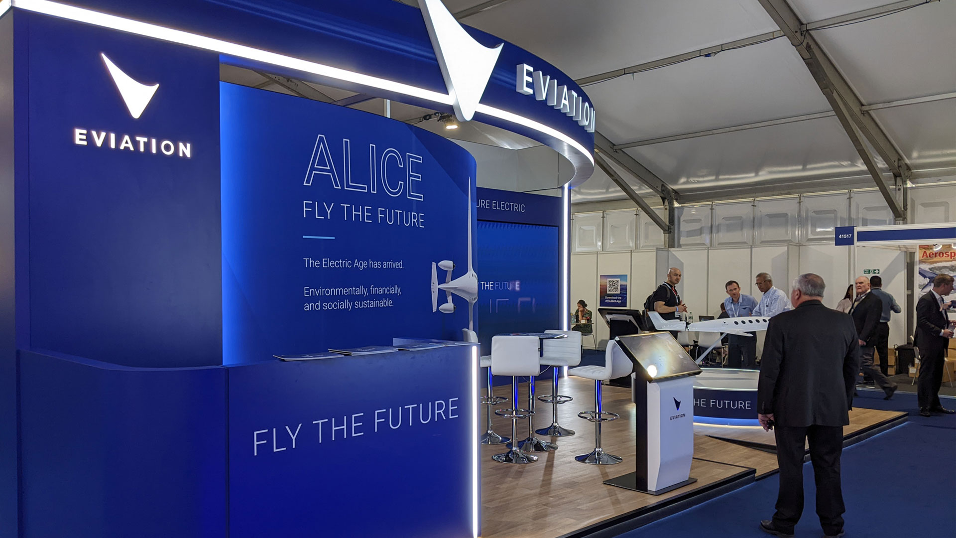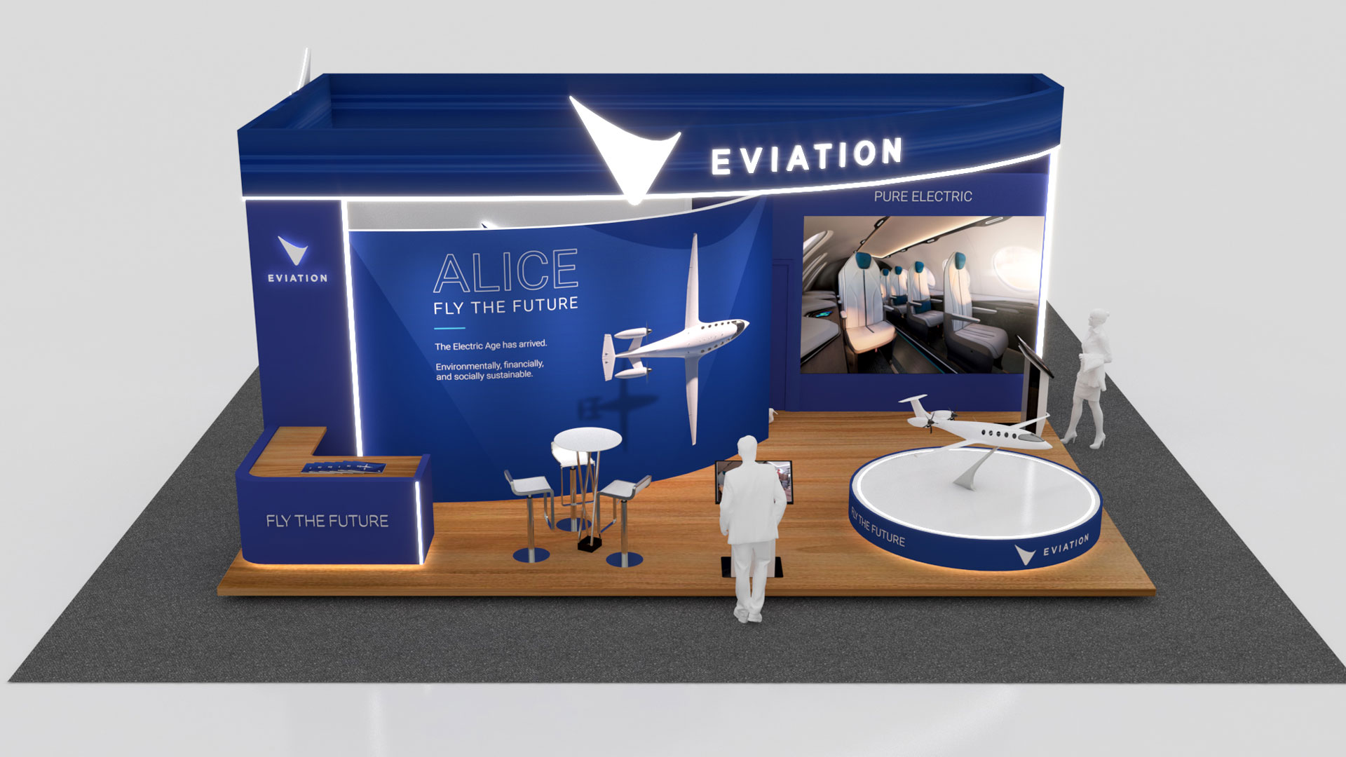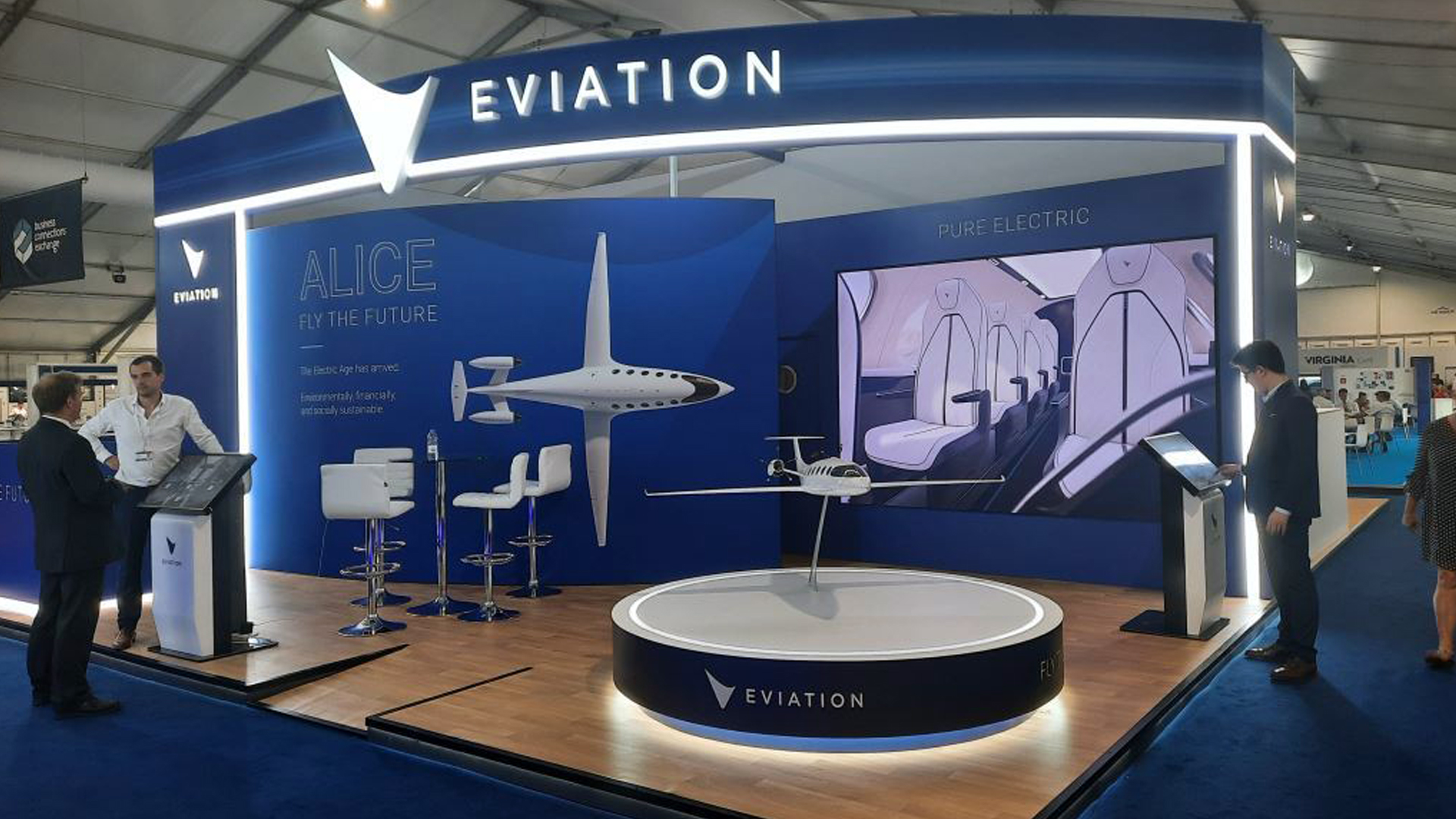 As the centerpiece of our booth, the final slide featured a captivating video displayed on a massive media wall at the entrance. This video artfully emphasized the organic lines of Alice's fuselage, its futuristic nacelles, and its luxurious interior. Alice, in all her glory, was portrayed in a fresh and cutting-edge light. The Commuter version of Alice can comfortably carry nine passengers at a brisk 240 knots, boasting an impressive range of up to 650 miles. What sets Alice apart is her remarkable efficiency, operating at a fraction of the cost of conventional jet aircraft. With this pioneering aircraft, we aspire to redefine the travel experience and pave the way for a new era of sustainable aviation.